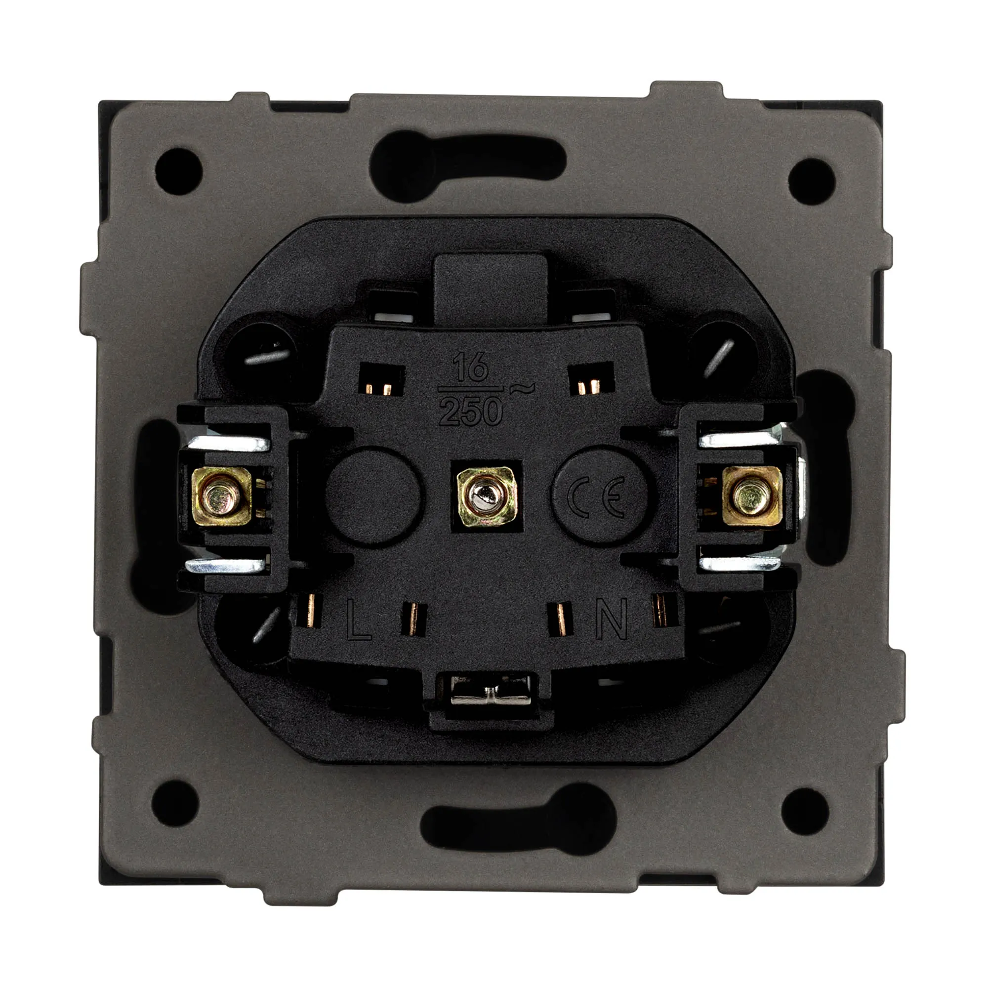 Механизм розетки с заземлением и влагозащитной крышкой на 1 пост. Цвет - графитовый. Без фронтальной рамки. Уровень пылевлагозащиты IP44. Розетка устанавливается в стандартный подрозетник круглого сечения диаметром 60мм.
